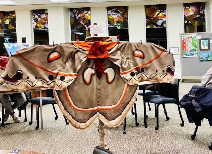 We can’t resist sharing a few more photos of some of the amazing art. Here is the 2nd Place art for Juniors, a life-sized cloak, cut and sewn from old white blankets that the young Kingston artist, Rowan Wicke, found at a community “Buy Nothing” event at Skeleton Park. She recommends making things by hand, especially with friends, and after she sewed this cloak, she painted it to match the indicator species, the Cecropia Moth. The lighter cecropia moth died out during the era of coal energy, Rowan wrote, because they stood out easily for bird predators against the grey soot-covered walls. She talked about the importance of community events, of handmade items and costumes for Hallowe’en, for protecting our pollinators’ habitats even with the energy we choose. Here is a photo of her with Ted Hsu, who gave her the award and posted it on his website.