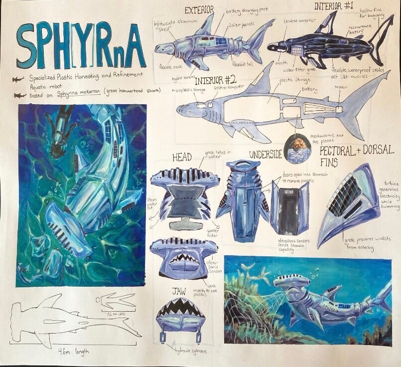 5th Place Senior Art Award went to Lana Wilson of Holy Cross SS. Her shark robot is a plastic digester, with hydro turbines in the fins to power it. It will ingest plastic, including ghost nets on coral, and the mealworms inside will digest it, turning it into C02 and water. Take note, inventors!"
