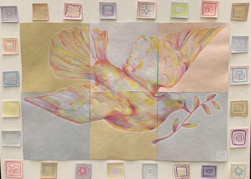 3rd Place Senior Art went to Charlie McGowan, LCVI for “Hope.” She dyed her paper with avocado pits, turmeric, maple leaves, and berries, created a quilt border to represent community, and wrote about the need for hope for a future with nature and human rights restored, including freedom for children in Gaza.