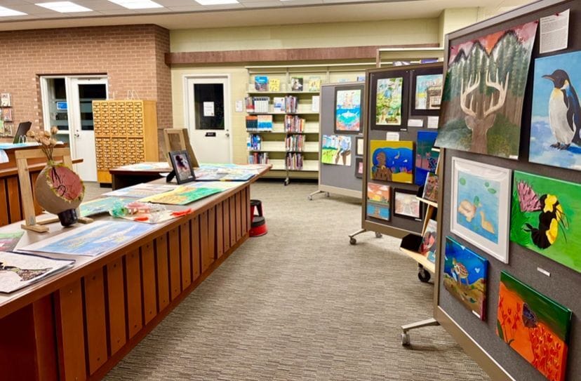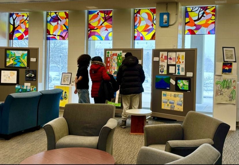 The YIF exhibition turned the Queen’s Faculty of Education Library into an art gallery December 3-13th. The librarians and staff at the Queen’s Education Library at McArthur Hall were exceptionally kind, warm and helpful. A million thanks to Librarians Nathalie Soini and Shelley Woods and staff for letting us fill the sunny space with student art and writing, and hold our Storytime evening event there. What a gorgeous library that is! As well, we thank all the students who were studying in the library as our visitors walked around quietly, admiring youth art. Your powers of concentration, (and the earbuds) were great.