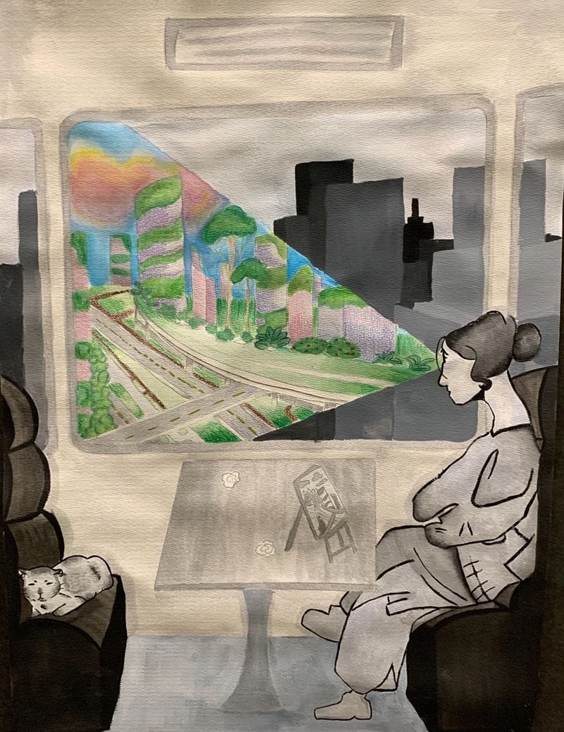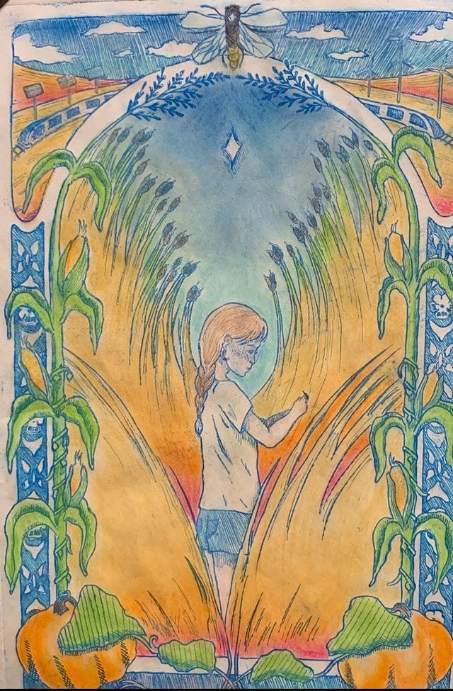 Senior artist Caitlin Ball of Sydenham HS won 2nd Place for “Postscript” carved on plexiglass with colour added. Inspired by “Braiding Sweetgrass,” by Robin Wall Kimmerer , this art shows a girl in the future in a restored wetlands full of cattails with the fireflies returning. The 3 Sisters are on either side, corn, beans and pumpkins, and in the distance, there is renewable energy above a maglev train hinting at better energy choices in the future.