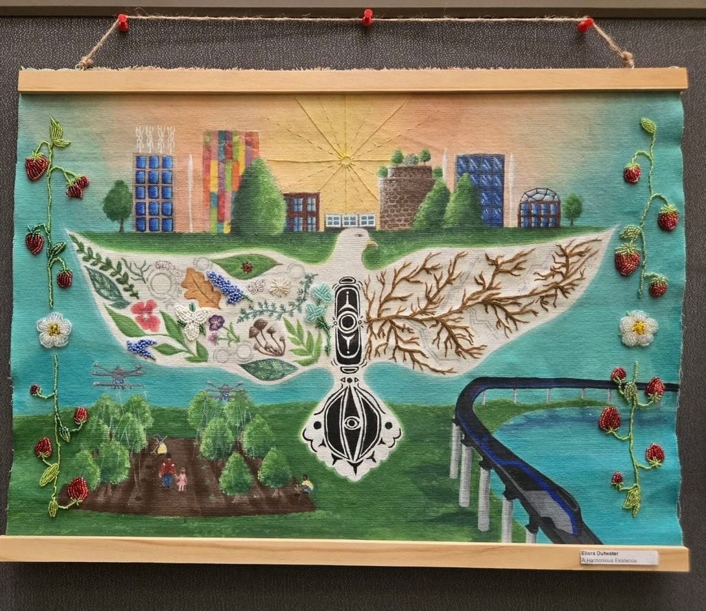 First Place Senior Art winner was Ellora Outwater, grade 12, Sydenham HS for “A Harmonious Existence.” There is a lot hiding in her artwork. The eagle represents strength, courage and wisdom and Indigenous wisdom. It shows harmony between nature on one wing and electrical wires on the other wing for technology. The far background shows a beautiful cityscape with solar and wind energy, the farming includes trees and biochar. Ellora hand beaded the strawberries growing up the sides to connect this futurescape with happy memories of her own family strawberry picking every year.