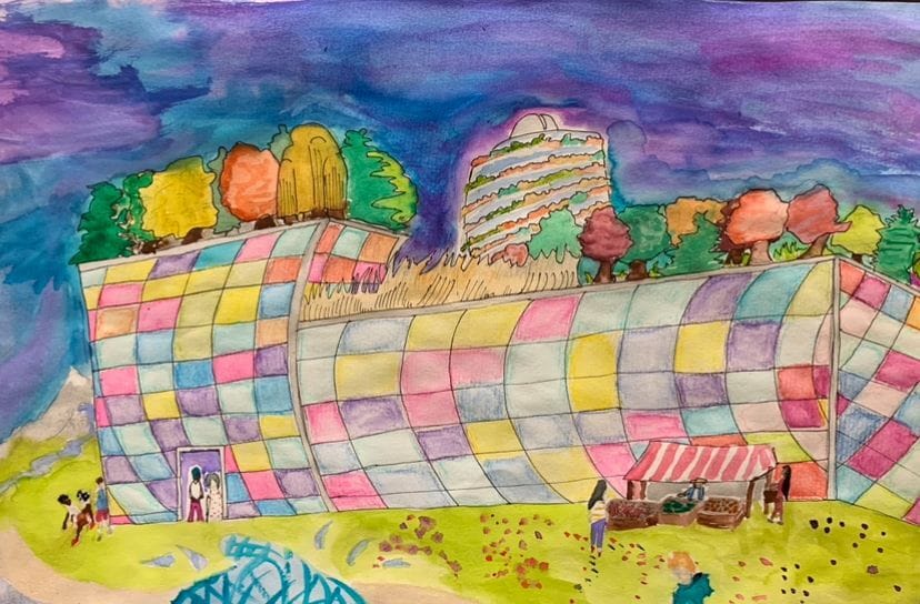 The First Place Junior Art winner was Isaac Caron, grade 8, from, École secondaire publique Mille-Îles for “A Better Future, Now” which centers a large public library covered in colourful solar panels made from cellulose, with local farmers outside, a green roof and an appealing green apartment building behind.